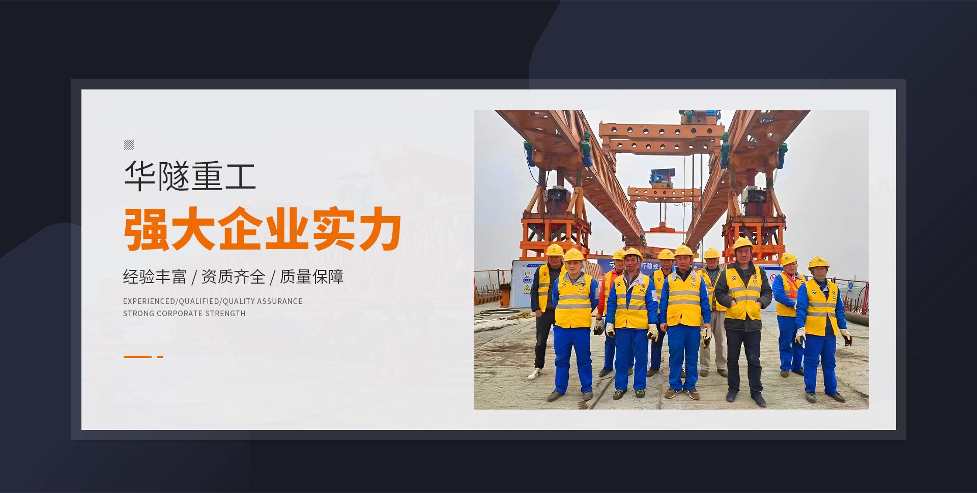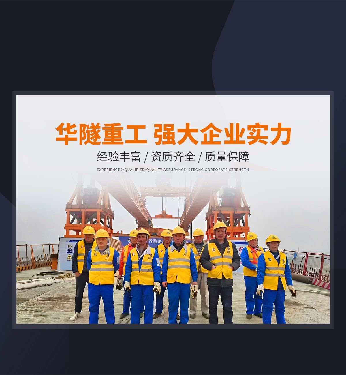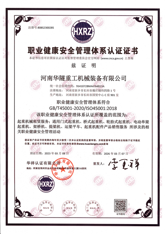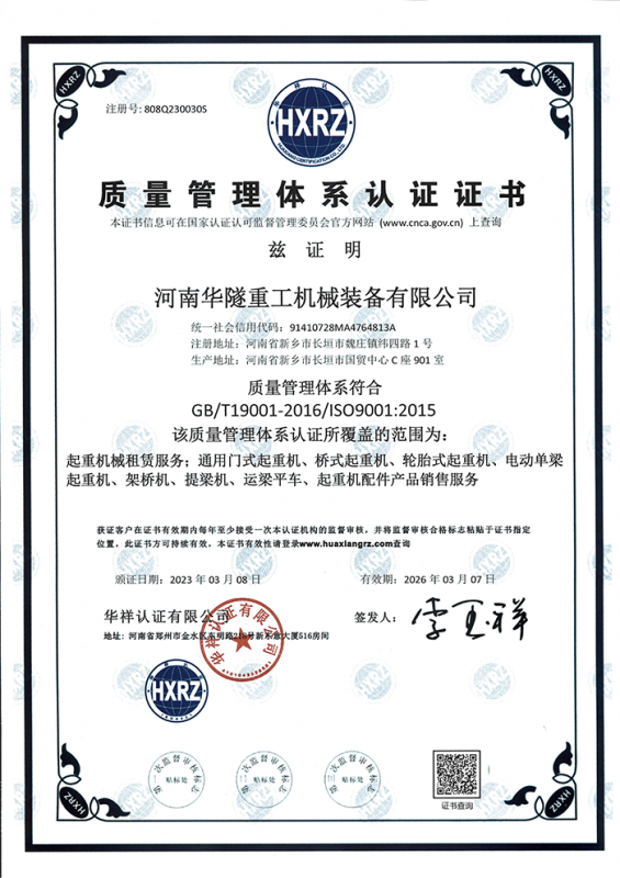 河南華隧重工機械裝備有限公司主要從事通用門式起重機、橋式起重機、電動單梁起重機,輪胎式起重機、架橋機、提梁機、遠梁平車、鋼絲繩電動萌蘆、卷揚機、起重配件制造、銷售:起重機械租賃、安裝和維修,起重設備園收,機械設備維修,鋼結構工程承包,橋梁工程及技術咨淘服務,銷售五金制品、機電設備:建設工程監理,建設工程設計,各類工程建設活動,建筑勞務分包,建筑物折除作業,施工作業,工程管理服務,土石方工程施工,裝如發運。  公司已通過IS0國際質量、環境、健康與安全三合一標準認證,特種設備制造許可證和特種設備安裝改造維修許可證。擁有完熟的質量管理體系。嚴格的管理制度,強大的生產能力和先進的檢測手段,在保證產品質量的同時,也具備了極強的市場競爭力?! 」緢猿挚萍紕撔聻槔砟睿a品質量為核心,注重信譽,建立了減信可靠、快捷、思速。便利周到的售后服務網絡?! ∥覀儞碛械募夹g專家和技術服務隊伍為客戶提供充善的售前技術支持和全天候的售后服務體系,讓您無后顧之憂,享受一站式的超值服務?!  叭A隧重工,伴您成功“是華隧重工永遠的宗指,真被的希望與各界朋友攜手并進。共創輝準!
